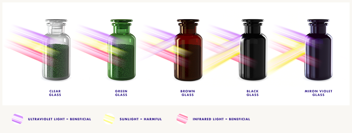 Protegeix contra l'espectre de la llum visible (llum solar), que és molt perjudicial en accelerar el procés d'oxidació dels olis i només permet l'entrada de l'espectre de la llum ultraviolada, que té la capacitat de preservar i mantenir els ingredients actius durant un període molt més llarg. Per tant, el vidre violeta pot fins i tot millorar la ja alta qualitat de la formulació.